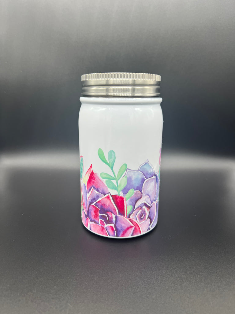 Our Mason Jars are a unique way to keep your drinks hot or cold. Featuring a 17 ounce capacity and double walled insulation, the mason jar tumbler will maintain your desired temperature and preserve the flavor of your beverage. A metal straw is included, but please note jar is likely too large to fit in most cup holders.